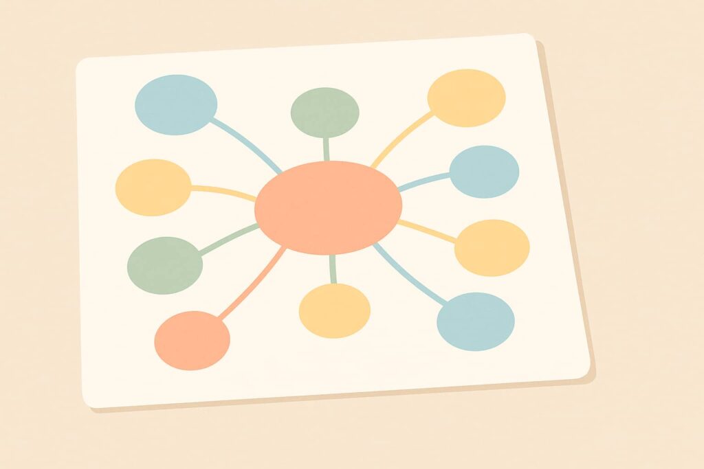 マインドマップとは、中央にテーマを書き、そこから枝分かれするように関連するキーワードやアイデアを広げていく思考法です。