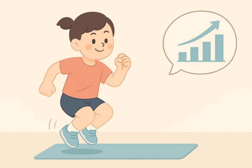 記録の付け方は、到達点や回数だけでなく、接地音の小ささ・着地の静かさ・姿勢の安定など動作品質を◎◯△でメモするとわかりやすいです。週単位で◎の数が増えるかを確認すると、負荷を上げなくても上達を実感しやすくなりますよ!