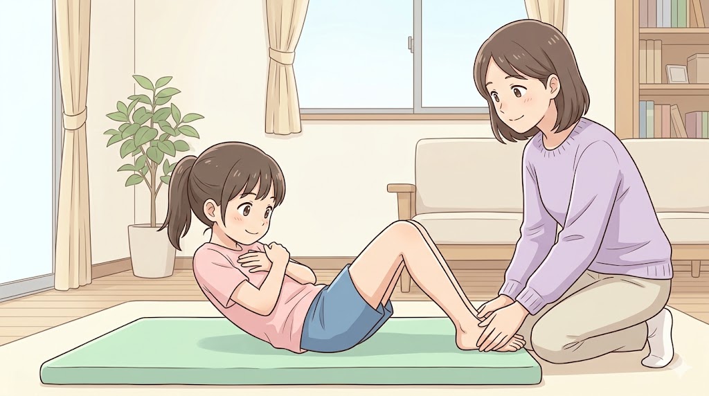クランチに慣れてきたら、保護者の方に背中に手を添えて支えてもらいながら上体起こしに挑戦します。「最初の10度分」だけ手で軽く押し上げてもらうと、起き上がる感覚を非常に掴みやすくなります。 補助を減らす目安は「3回連続で正しいフォームで起き上がれたら次のステップ」です。慣れたら少しずつ補助を減らし、お子さんが余裕を持って自分の力だけで起き上がれる範囲を段階的に広げていくのがおすすめです。 |