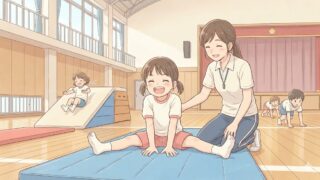 - レベル2:傾斜を緩くする、段差を低くする(跳び箱1段やマット2枚)。少し自力が必要になる。