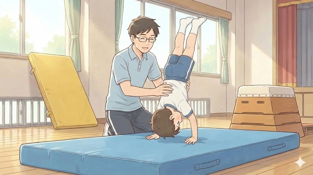 まずは「前転(でんぐり返し)」や「壁登り倒立」など、お子様が「これならできる!」と思えるレベルまでハードルを下げて自信をつけさせてあげてください。