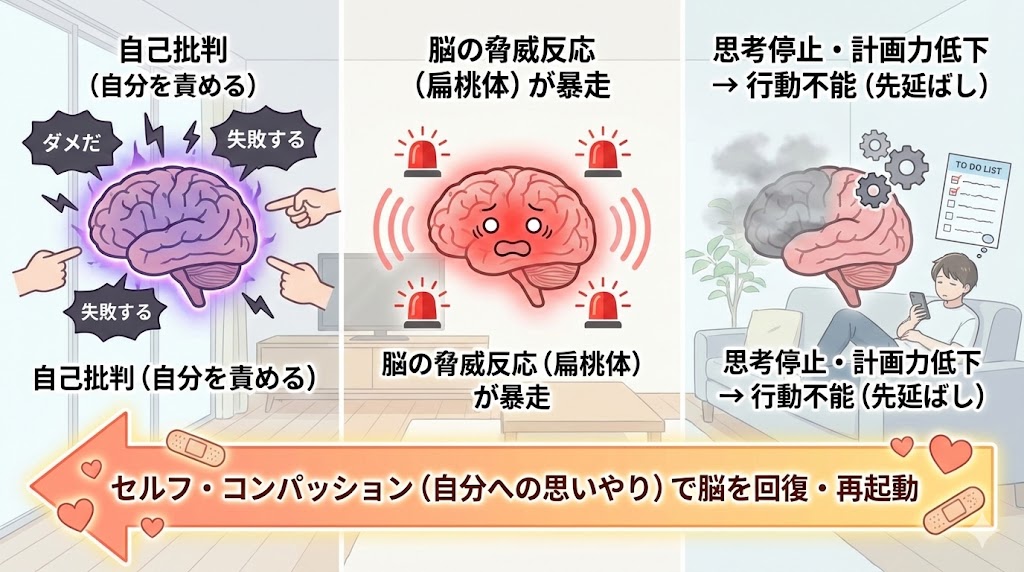 「なんでこんなこともできないんだ!」という自己否定の言葉を浴びせると、脳の脅威検知システムである「扁桃体(へんとうたい)」が激しく活性化します。脳はこれを「敵からの攻撃」と同じレベルの生命の危機として認識します。
