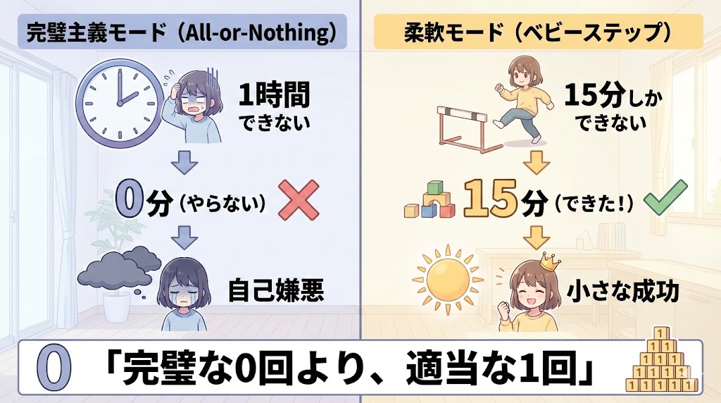 - 完璧主義の人:「1時間できないなら意味がない」「計画が崩れた」と判断し、0分(やらない)を選択します。