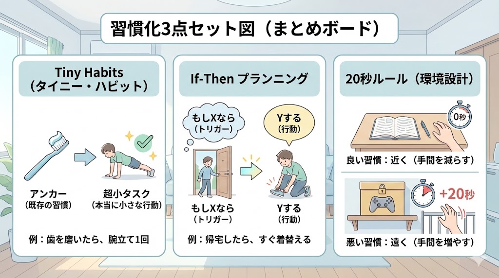 「気合い」で自分を動かそうとするのは今日で終わりにしましょう。脳の仕組み(If-Then)と部屋の環境(20秒ルール)を味方につければ、努力は「苦しい闘い」から「淡々とした日常」へと変わっていきます!