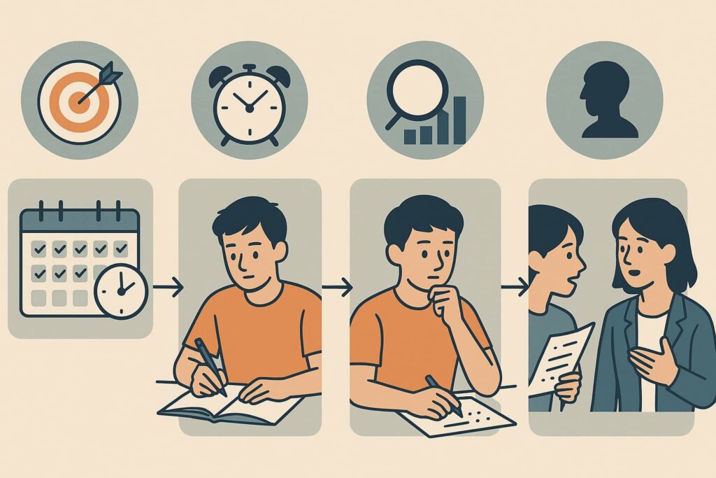 方法は時間帯と手順に落とし込み(例:平日20時に30分練習→5分自己チェック→週末に他者レビュー)、