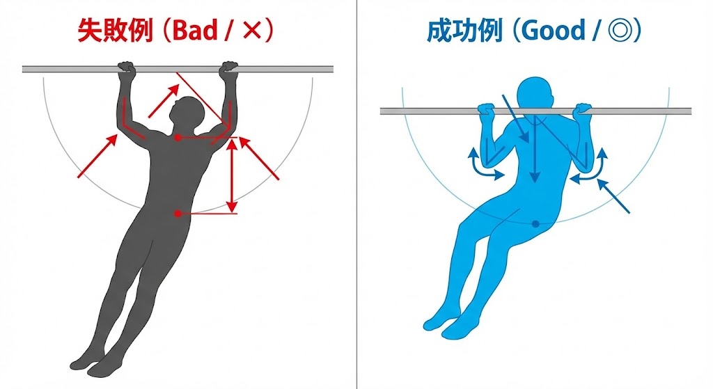 - 成功する人: 肘を90度近くまで曲げ、鉄棒をおへその位置にガッチリと固定している。→回転半径が小さく保たれ、遠心力を回転スピードに変換できる。