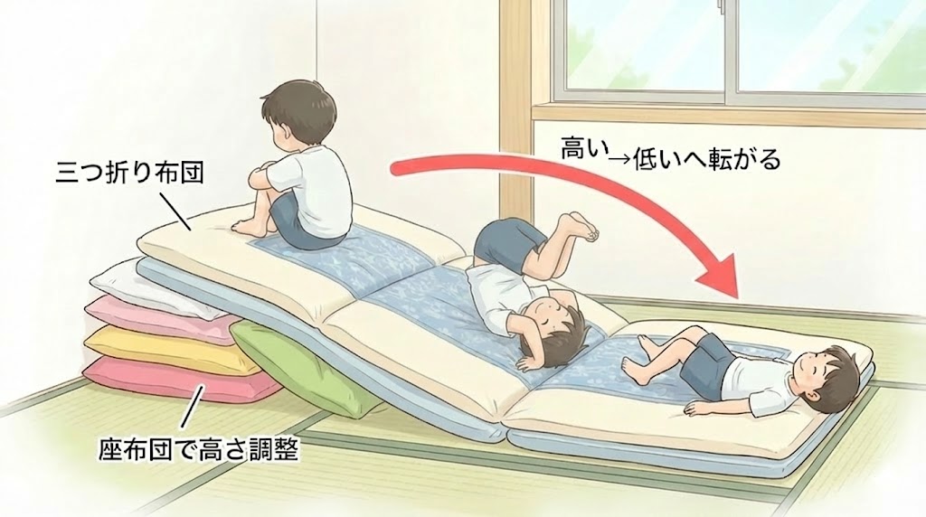 布団を三つ折りにしたり、片側に座布団やクッションを挟み込んだりして、なめらかな「坂道」を作ります。お子さんを坂の上(高い方)に座らせ、低い方に向かって転がらせてみてください。