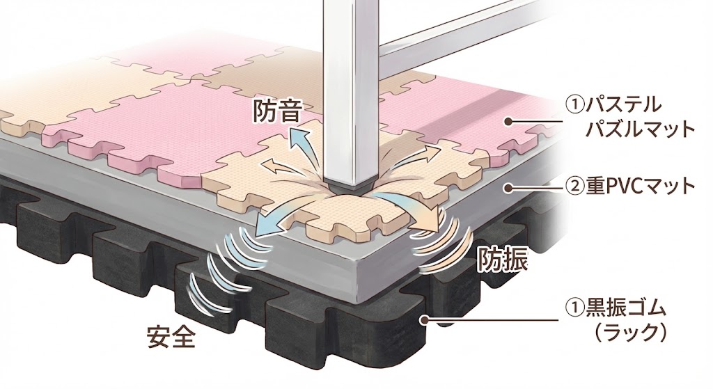 - 中間層(防音・安定):その上に、厚さ6mm〜10mm程度の「PVCマット」を敷きます。鉄棒全体のズレを防ぎ、床への振動伝達を面でブロックします。