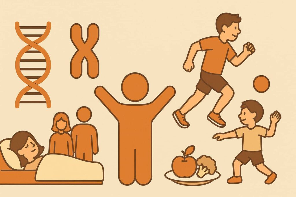 まず、生まれ持った面では、父母から半分ずつ受け継がれる遺伝情報が、身長・骨格・筋肉の質・ホルモンの働きなど、体の基礎設計に関わるとされています。