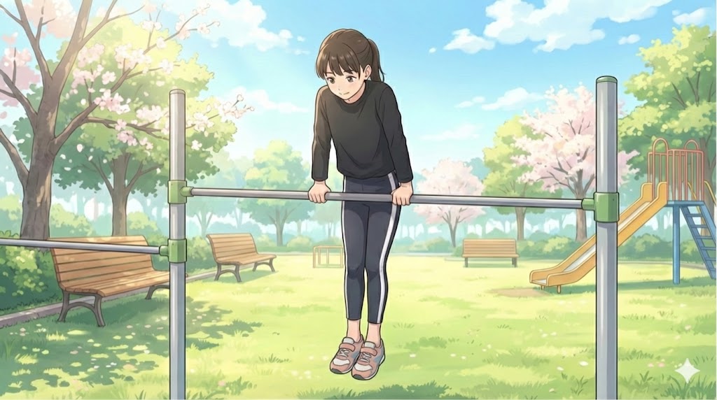 - やり方: 鉄棒を順手(親指を下から回してしっかり握る)で握り、足を地面から離してぶら下がります。