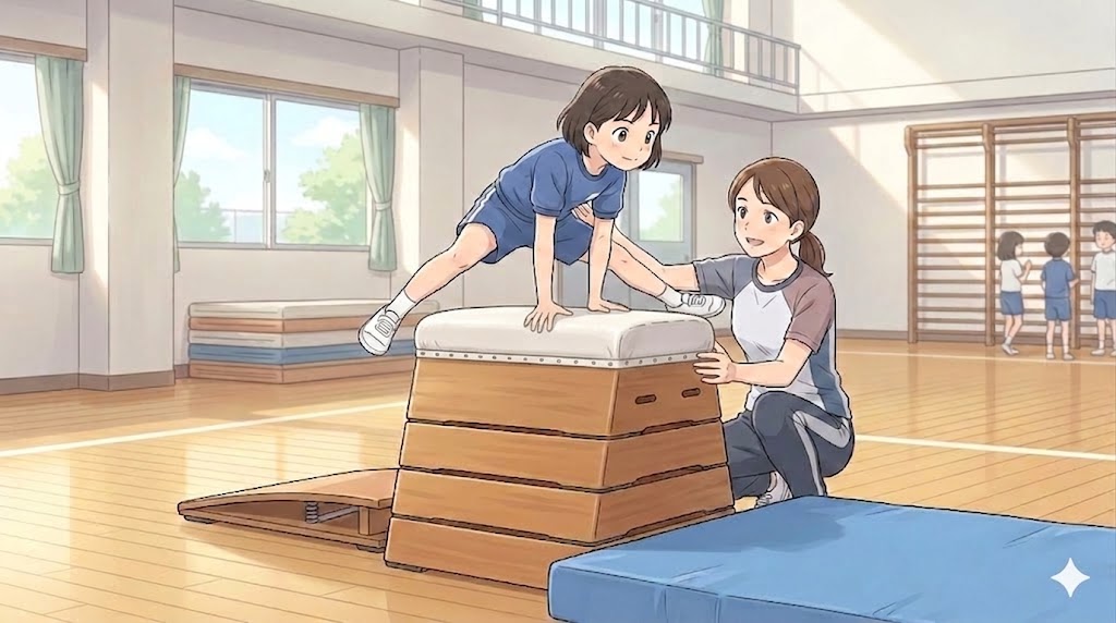 または、跳び箱の一番上の柔らかい部分(頭部)だけを床に置いてまたぐ練習など、視覚的な高さと物理的な硬さを徹底的になくしてあげることが大切です